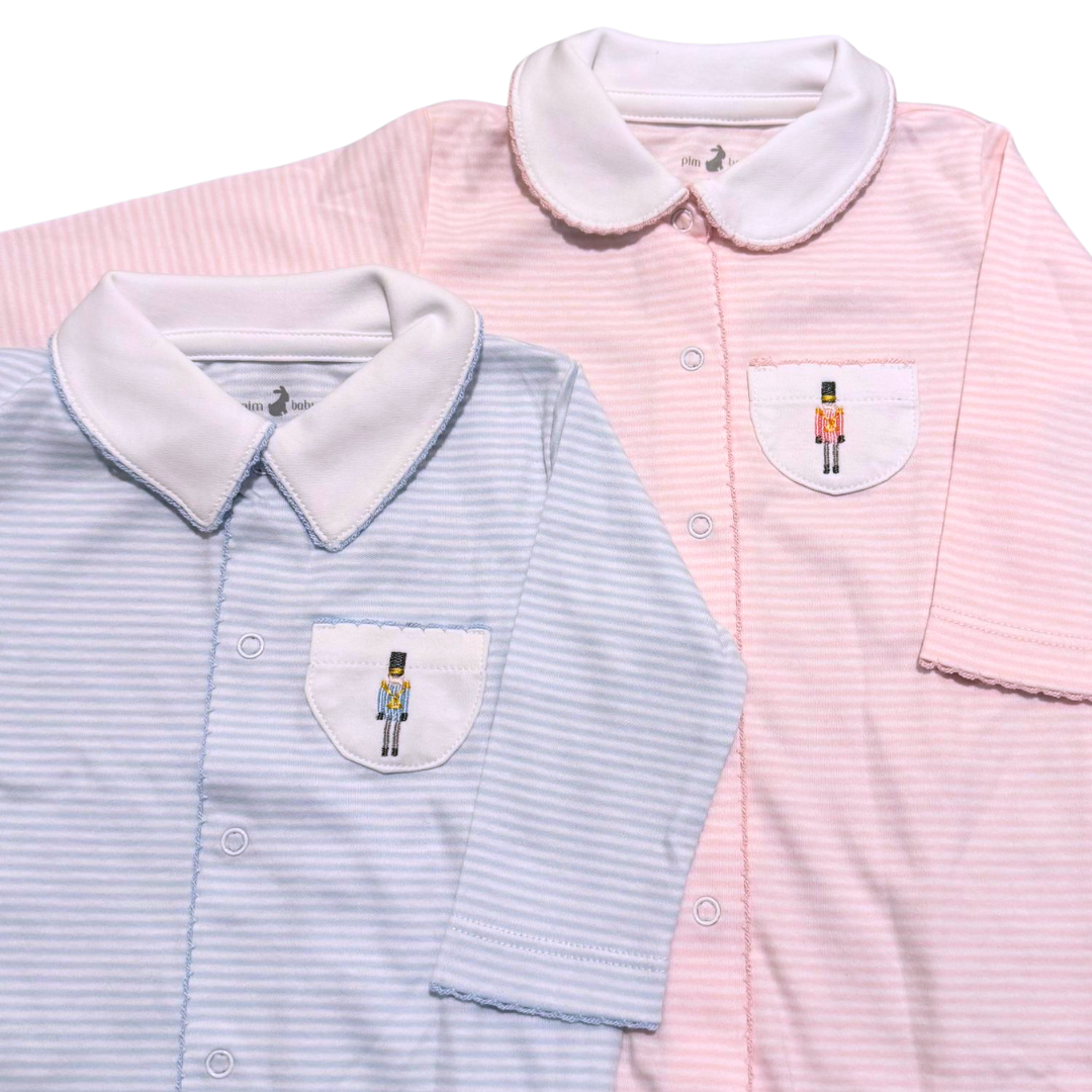 Why we love it: Our cozy 100% Pima cotton footie, featuring festive Nutcracker embroidery. Perfect for holiday snuggles.